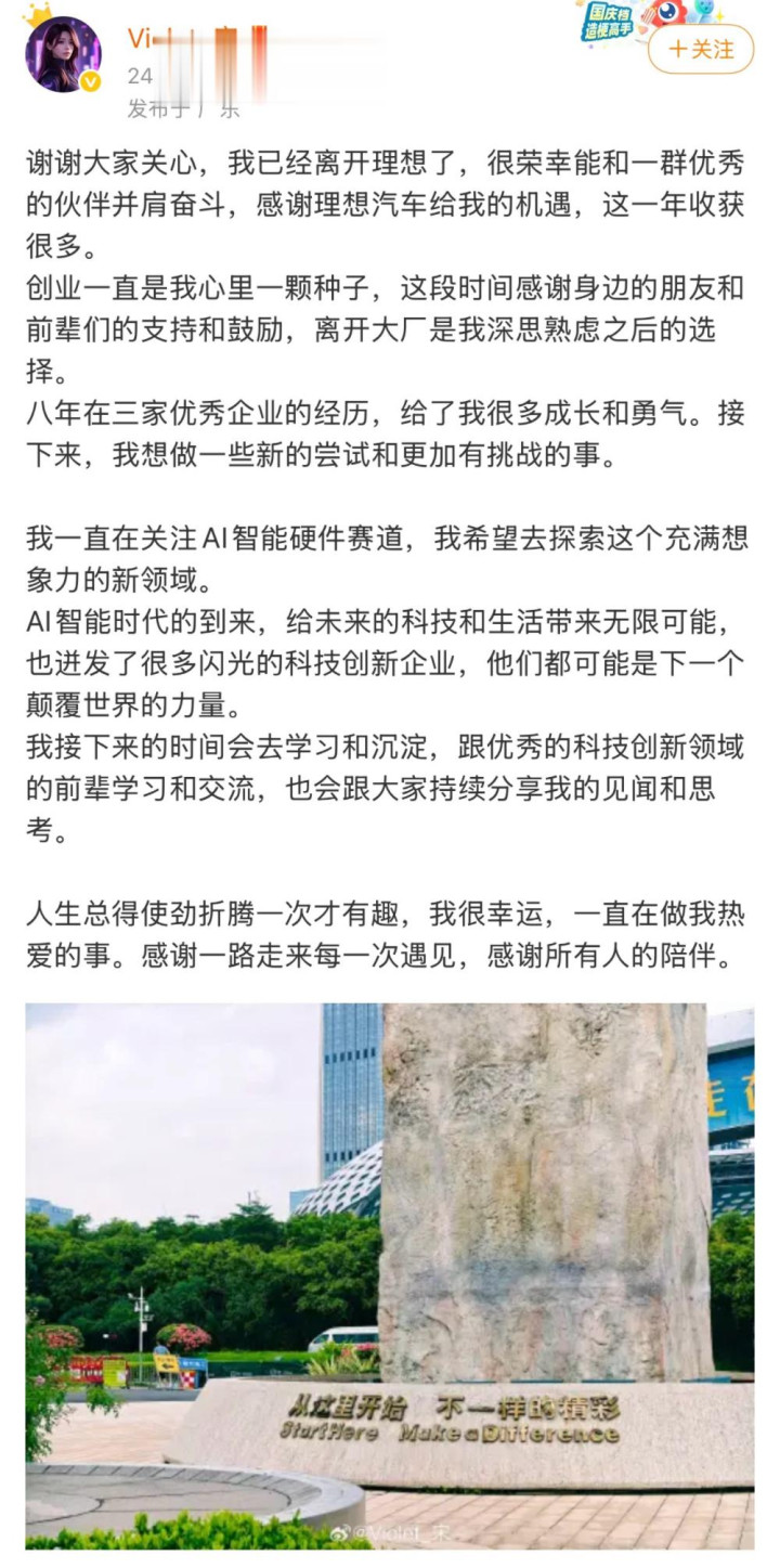 2024年10月,宋紫薇发布微博宣布已离职理想,并在博文中称“创业一直是我心里的一颗种子”,提到将投身AI智能硬件赛道的个人意向。