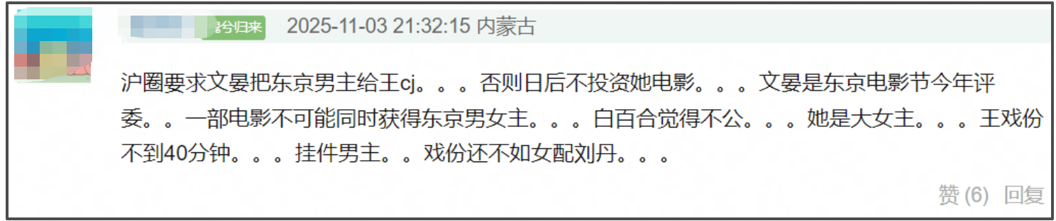 网友爆料,华语导演文晏担任了本届东京电影节评委,有撕奖的机会。而沪圈要求文晏把东京男主给王传君,否则日后不投资她电影,而一部电影不可能同时获得东京男女主,所以白百何感觉不公平,毕竟电影她是一番大女主,而王传君的戏份不到40分钟,属于挂件男主,甚至戏份还不如女配刘丹,这种情况下还给王传君撕奖,惹来了不满。